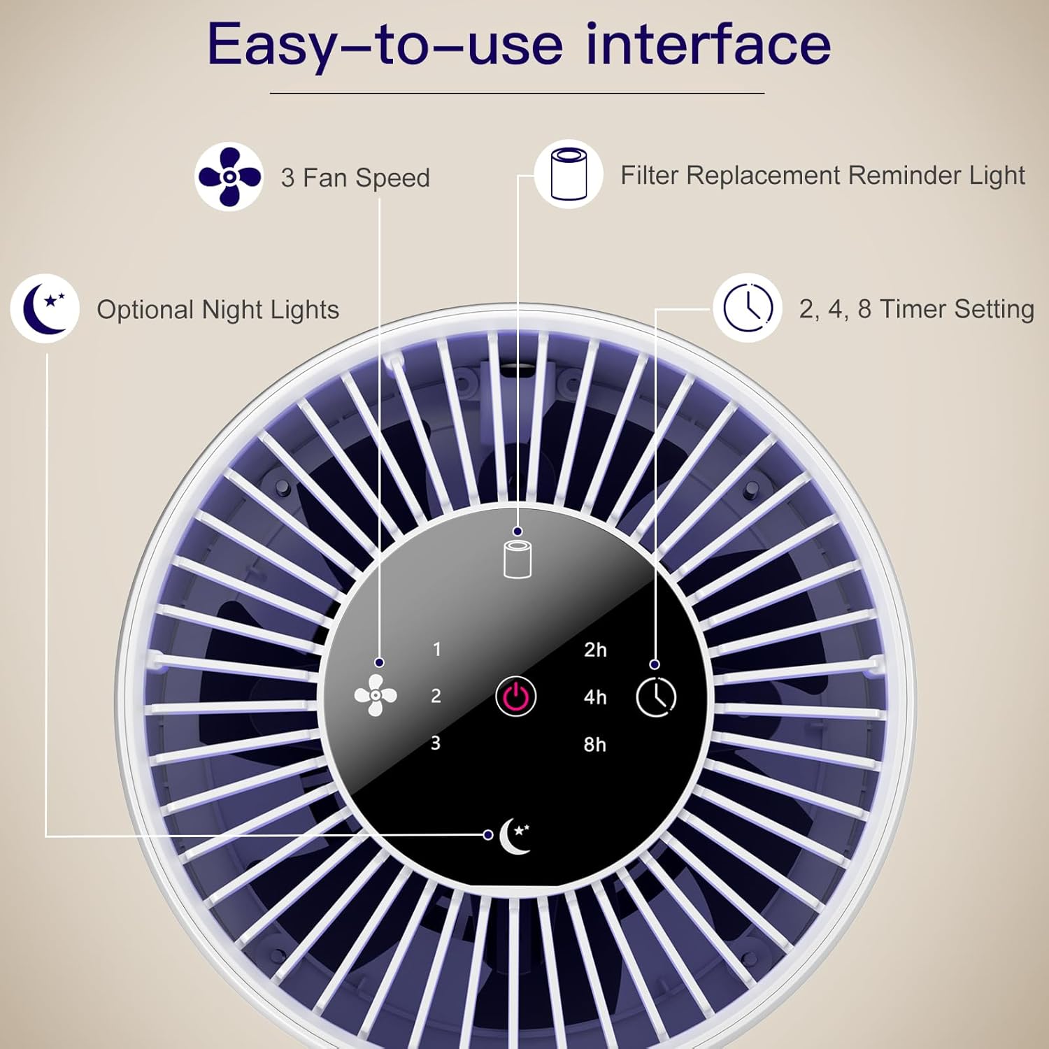 Die Timer-Funktion ermöglicht es Ihnen, den Luftreiniger für 2, 4 oder 8 Stunden automatisch laufen zu lassen und danach abschaltet. Dies ist besonders praktisch, wenn Sie den Luftreiniger tagsüber im Büro oder nachts im Schlafzimmer betreiben möchten, ohne sich um das Ausschalten kümmern zu müssen. Die Sleep-Modus-Taste schaltet das dekorative Licht aus und dimmt die Tastenbeleuchtung auf 50 %. Ein weiteres Drücken der Taste beendet den Sleep-Modus wieder.