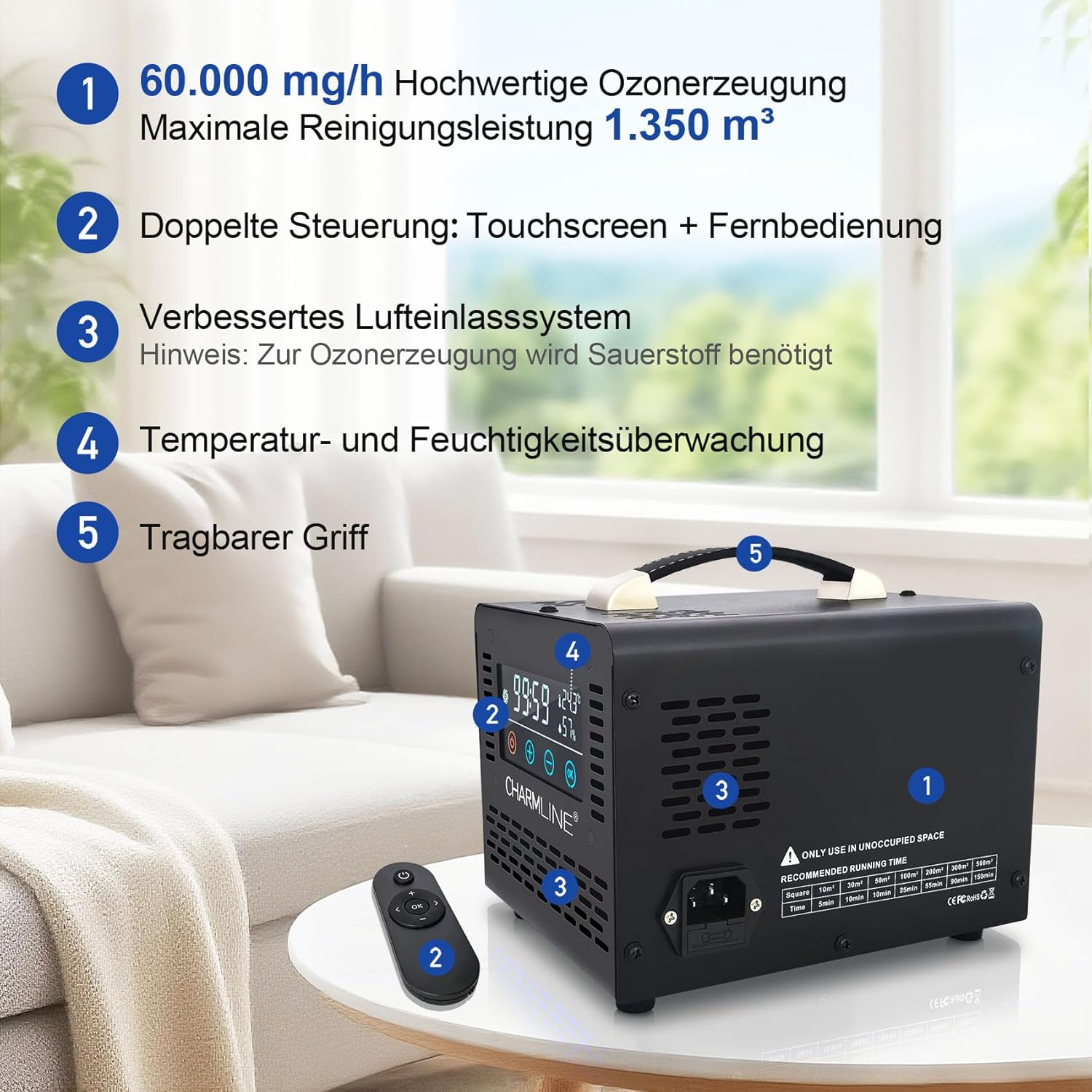 Der Charmline Smart Ozone Generator 60.000 mg/h ist mehr als nur ein Luftreiniger – er ist ein Versprechen: Das Versprechen auf reine, frische Luft, auf ein gesundes Zuhause und auf ein Leben ohne lästige Gerüche. Überzeugen Sie sich selbst – von der Technik, von der Qualität, von der Wirkung.