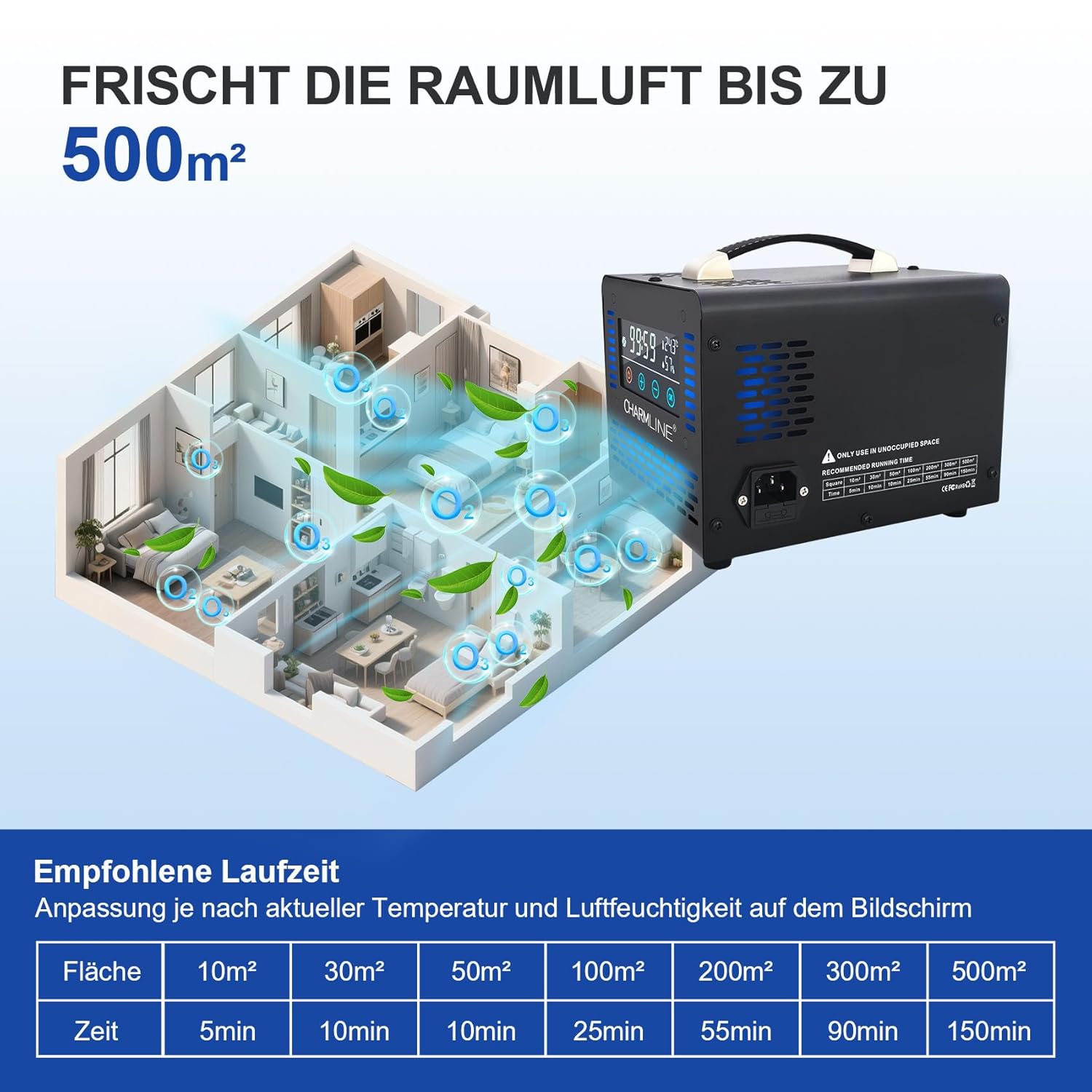 - 60.000 mg/h Ozonleistung für effektive Geruchsbeseitigung in Räumen bis zu 500 m²