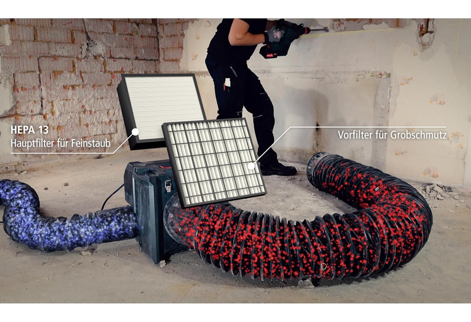 Der Vorfilter fängt grobe Partikel wie Sägespäne, Putzstaub und größere Staubanteile ab. Dadurch wird der Hauptfilter entlastet und hält deutlich länger. Der HEPA H13-Hauptfilter übernimmt dann die Feinreinigung: Er filtert 99,95 % aller Partikel aus der Luft, darunter auch Feinstaub, Allergene und unsichtbare Schadstoffe. Beide Filter können werkzeuglos gewechselt werden – ein klarer Vorteil in der Praxis.