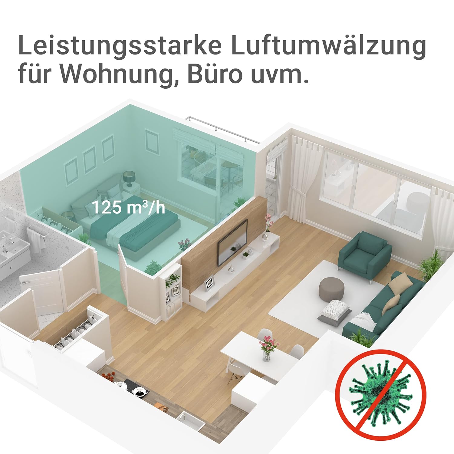 Trotz seiner kompakten Bauweise liefert der VirusEx eine beeindruckende Luftleistung von etwa 125 m³/h. Das bedeutet, dass in Räumen von 10 bis 13 m² die Raumluft mehrmals pro Stunde komplett ausgetauscht wird. Diese hohe Luftwechselrate ist entscheidend für eine effektive Reduzierung von Schadstoffen, Allergenen und Gerüchen in der Luft.