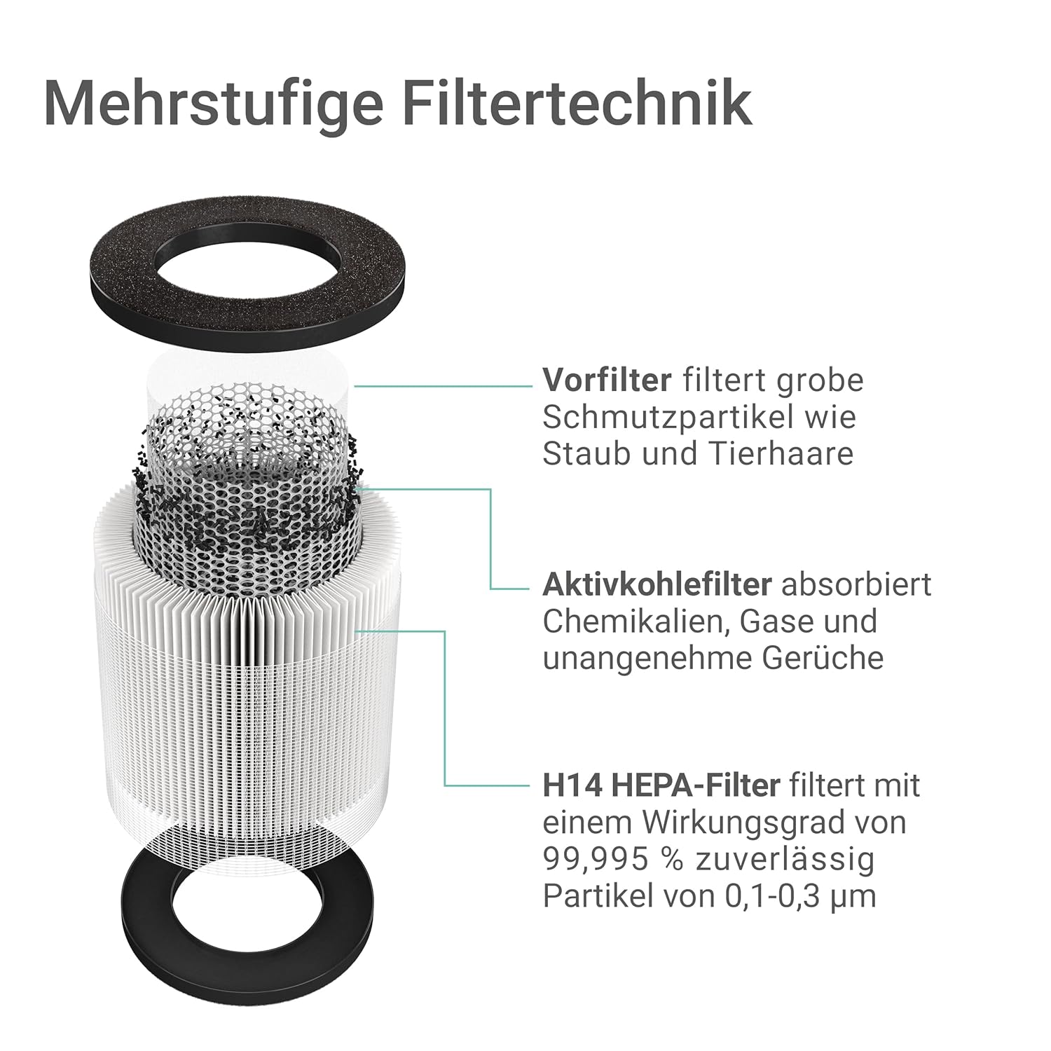 - Hochwertiges 3-stufiges Filtersystem (Vorfilter, H14 HEPA-Filter, Aktivkohlefilter)